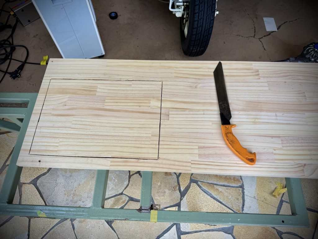 天板を、骨格に合わせてカットして、そのまま蓋になるように丁寧に仕上げていきますよぉ!